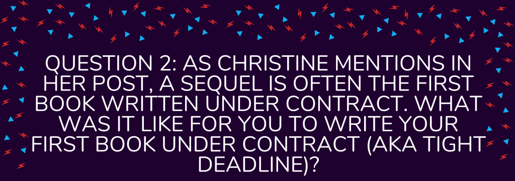 Katy: Please take this with a grain of salt, because right around the time I was turning in the final draft of book 1 I went part time at work. This made the experience of writing book 2 tremendously different than if I had stayed full time. Revising on deadline for book 1 + spending 40+ hours a week coding? Almost killed me. I did not want to repeat that experience with book 2. I knew I would burn out, and I was so excited about book 2 that I didn’t want that to happen. But even with being part time, writing on deadline was very scary for me. There was very little time to second guess myself, to explore the story the way I had in book 1, to do anything but hit my deadlines and pray my editor could help me sort out the messes. I had to have faith in my own writing like I never had before–faith that in 12 months I would wind up with a book I was proud of. I’m not quite there yet, but the end is in sight. I can see the shape of the finished book and I know, more or less, how to get there.
